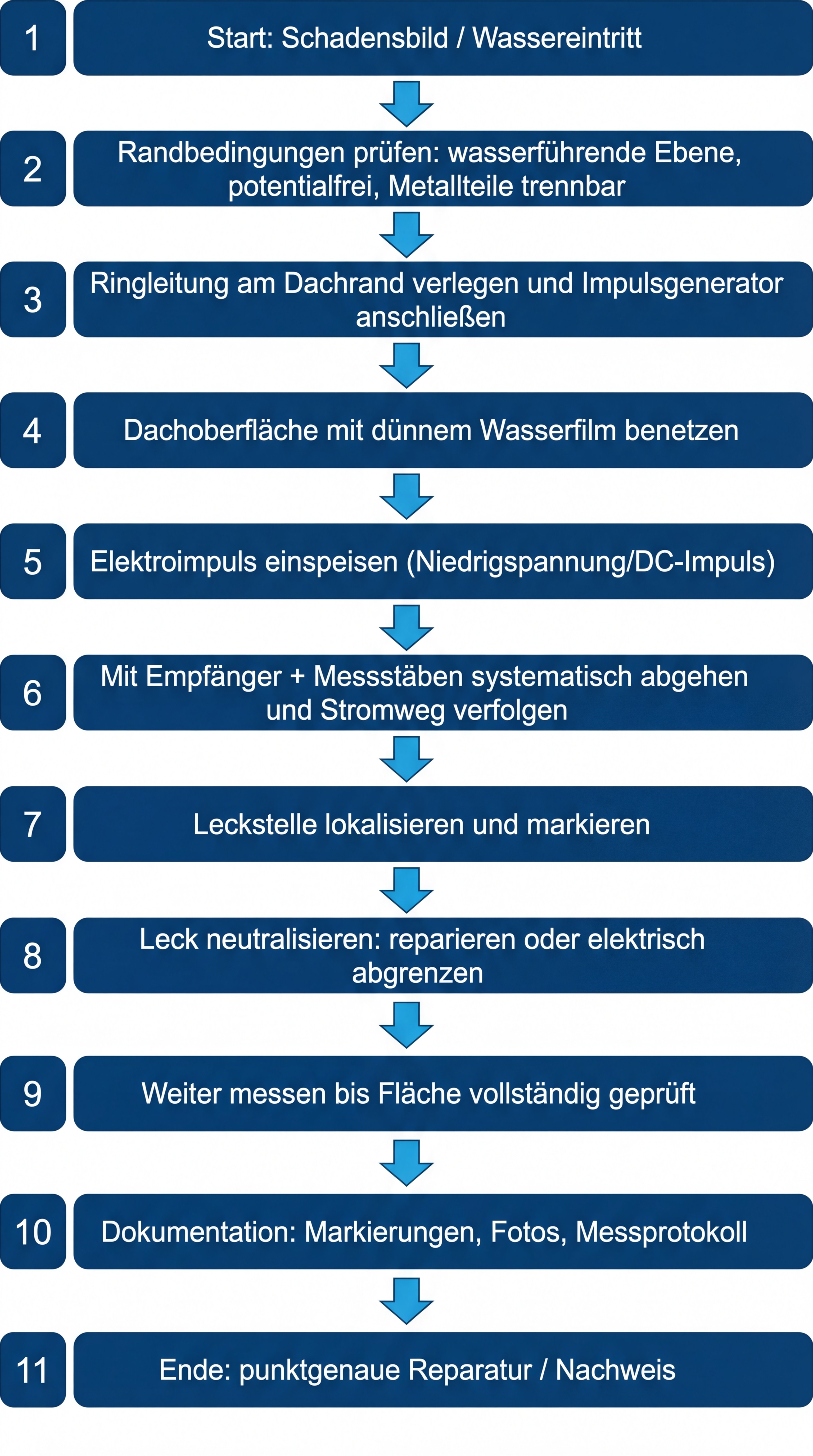 Das Verfahren nutzt die Leitfähigkeit von Wasser. Eine intakte Dachabdichtung wirkt elektrisch isolierend. Befindet sich jedoch eine Fehlstelle in der Abdichtung, kann Strom über Feuchtigkeit zur leitfähigen Unterkonstruktion abfließen.